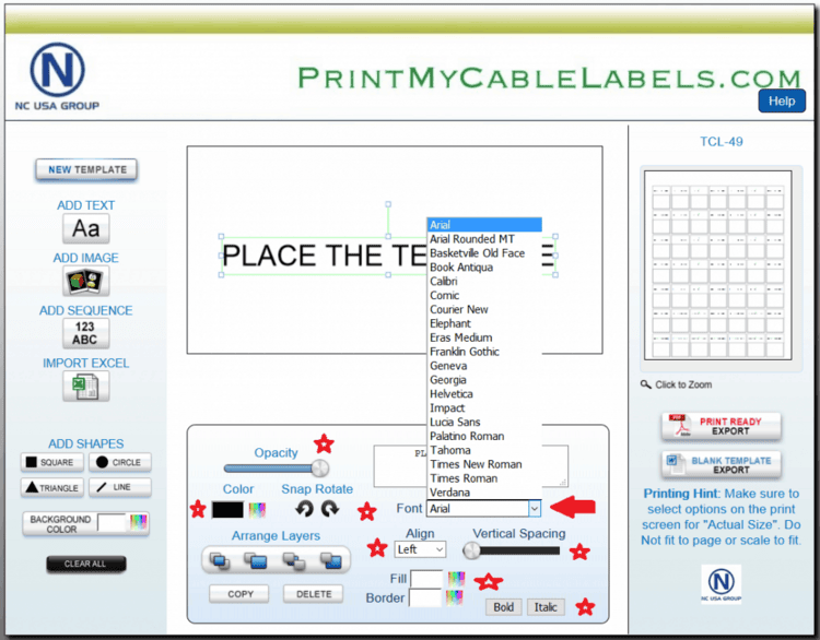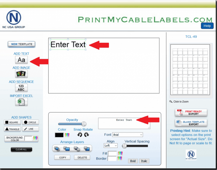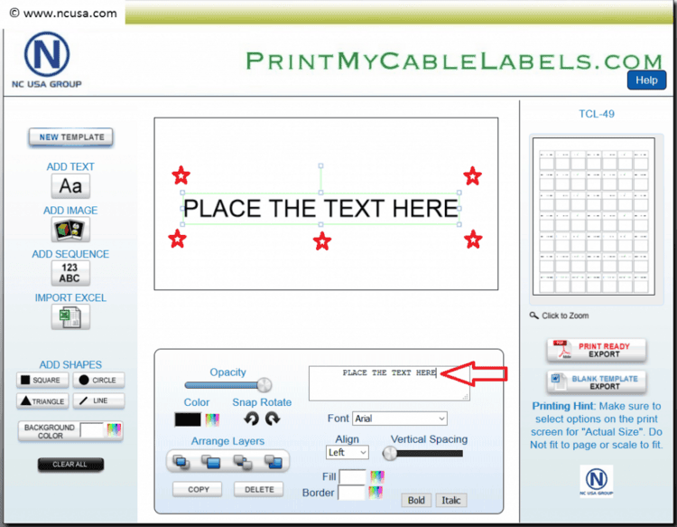 You may then change the text in the box in the bottom text section, you may add numbers or text for your cable labels and they will be ready for you to position the text on the label area.